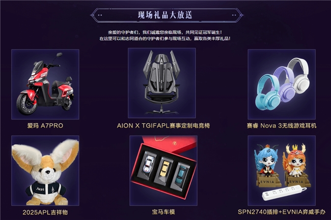 而赛事中最受关注的,莫过于为玩家准备的重重福利。 赛事方联合了多家赞助商,为现场和线上观众打造了一场福利盛宴。在现场,每一位到场的玩家都能获得专属限定伴手礼,包括精美实物联名周边和珍稀游戏道具。更令人惊喜的是,现场观众还能解锁2025APL赛事线下观赛礼包。赛事总冠名商爱玛电动车更是为现场观众准备了重磅福利——“爱玛A7PRO”实物抽奖,不知道谁才是那个幸运儿呢?