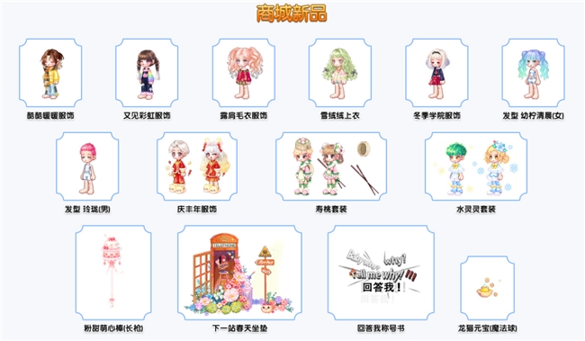 彩虹的新衣:商城新年专区已上新!“庆丰年服饰”“寿桃套装”等充满传统年味的时装可以直接购买。同时,“魔法时尚屋”的LA闪耀系列新品也华丽登场,想要在新年焕然一新的玩家,现在就可以去挑选心仪的装扮了。