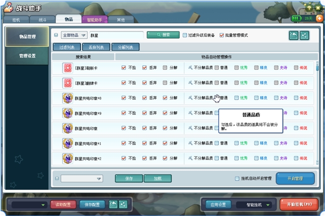 深度自定义:高阶的“一键技能连招”和“技能自动释放”为技术流玩家提供了秀操作的空间;而“自动物品管理”能预设道具的自动分解/保留规则,从此告别手动清理背包的烦恼。