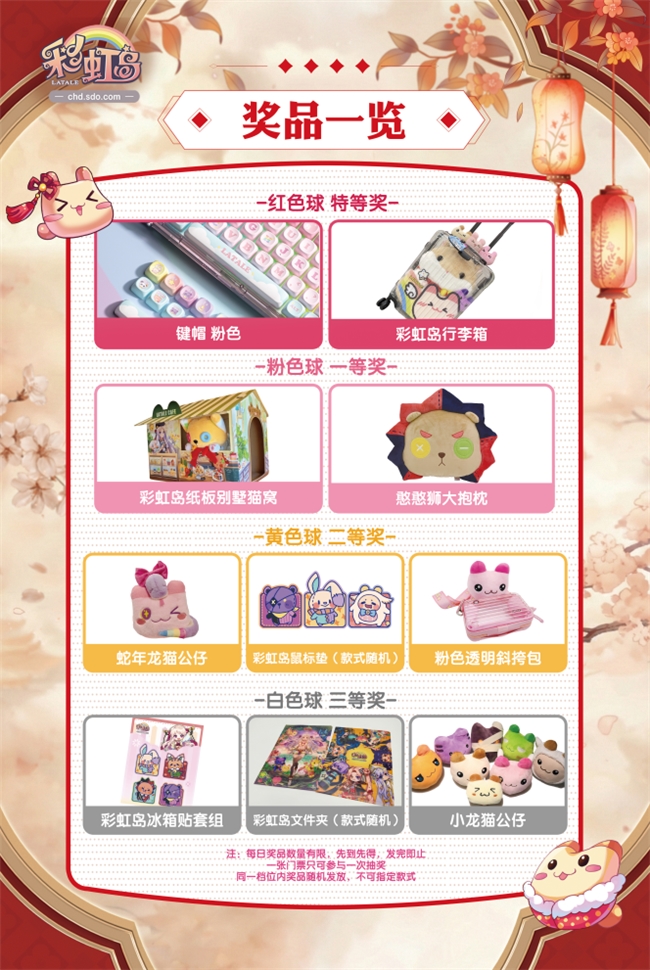完成互动集齐印章,即可参与“彩虹幸运大抽奖”,奖品包括彩虹岛行李箱、彩虹岛纸板别墅猫窝、粉色透明斜挎包、小龙猫公仔等多款限量精美周边。需要注意的是,所有实物福利均为每日限量发放,想要入手的话,记得早点来T08展位参与哦!